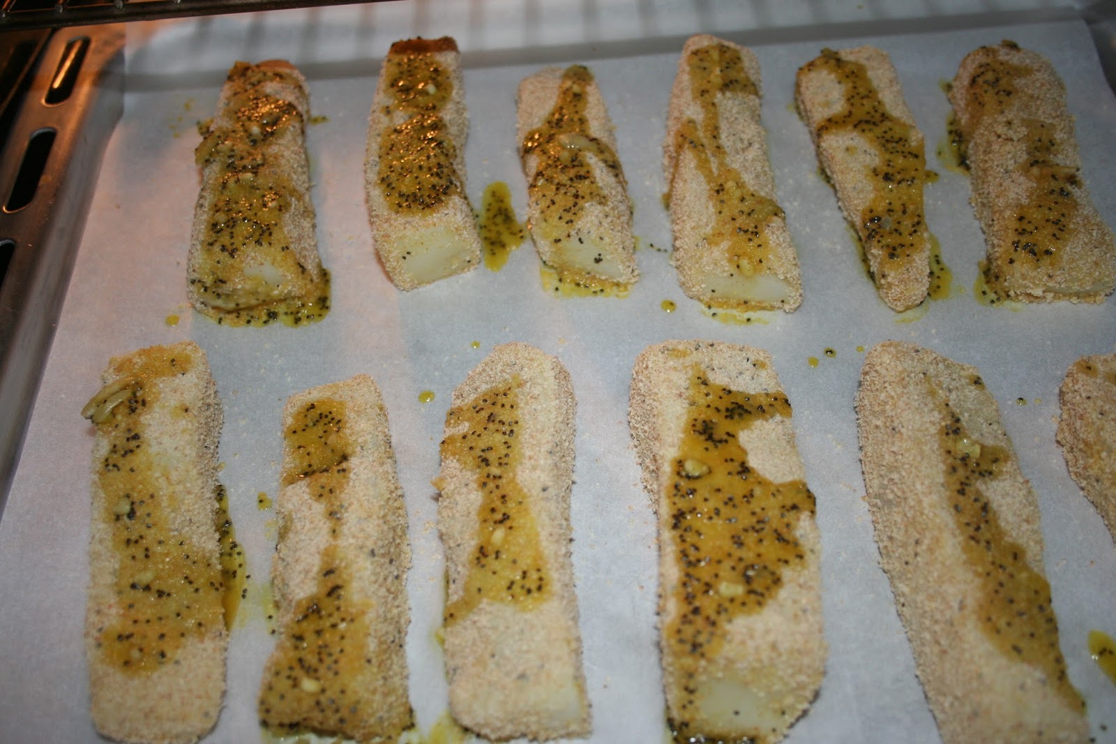 Num prato largo coloquei pão ralado. Forrei o tabuleiro do forno com papel vegetal. Passei as tiras pelo pão ralado e coloquei no tabuleiro. No fim de todas prontas, verti um pouco do molho que sobrou por cima de cada uma e levei ao forno por cerca de 25 minutos.