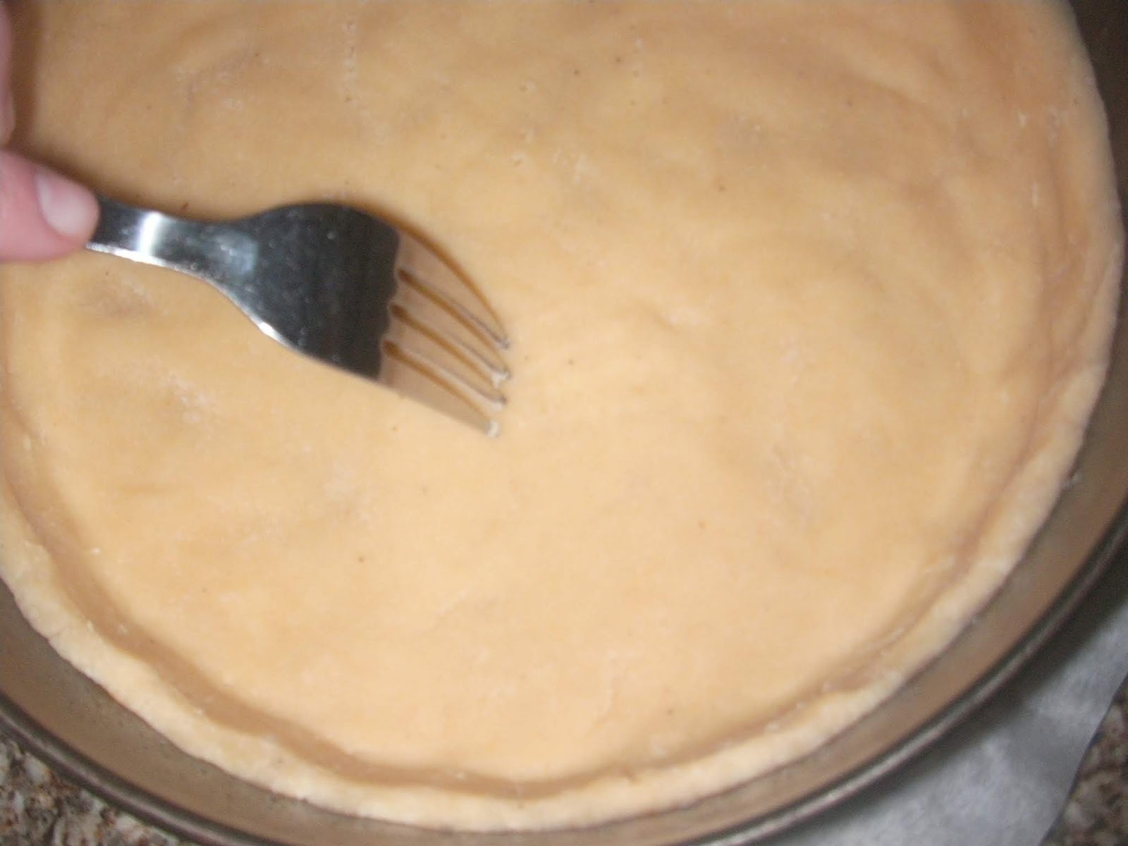 - Pressionei a massa no fundo e lado da forma. Fiz furos com um grafo. Levei ao forno 8 minutos. (Devem ter atenção que não pode ficar tostada pois ainda vai novamente ao forno.) Deixei arrefecer um pouco para "secar" antes de colocar o creme.