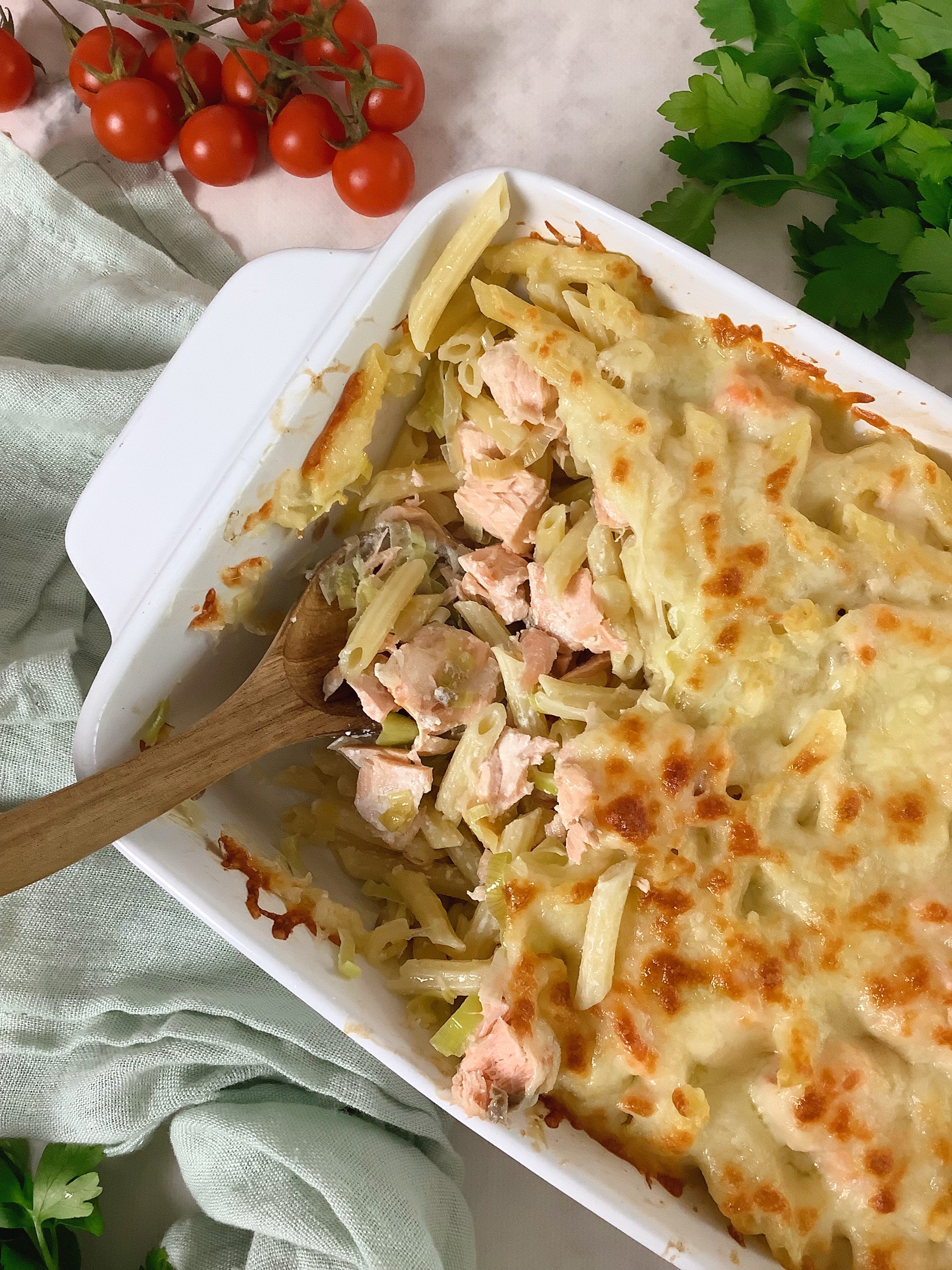 - Colocar a massa escorrida numa assadeira, espalhar por cima o alho francês, depois o salmão livre de pele e espinhas e partido em pedaços.